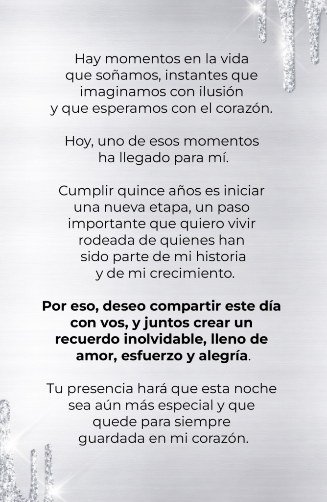Acompañamea celebrar este gran día Días Hs Min Seg FALTAN Fiesta SALÓN MILENIOS Lateral de Circunvalación 656 N,Santa Lucía CÓMO LLEGAR Dress Code Estrictamente formal Cuento con vos Tu presencia esmuy importante para mi CONFIRMÁ TU ASISTENCIA El mejor regalo es que vengas,pero si deseás regalarme algo,podés colaborar conmis sueños y anhelos.¡Muchas gracias! VER ALIAS ♡¡Gracias poracompañarme en estehermoso momento!¡A darlo todo!¡Te espero! × Datos para transferencia Nombre: Maria Eugenia Robles Alias: roblesmica CVU: 0000003100002609897885 Copiar CVU Copiar Alias Tu navegador no soporta audio.